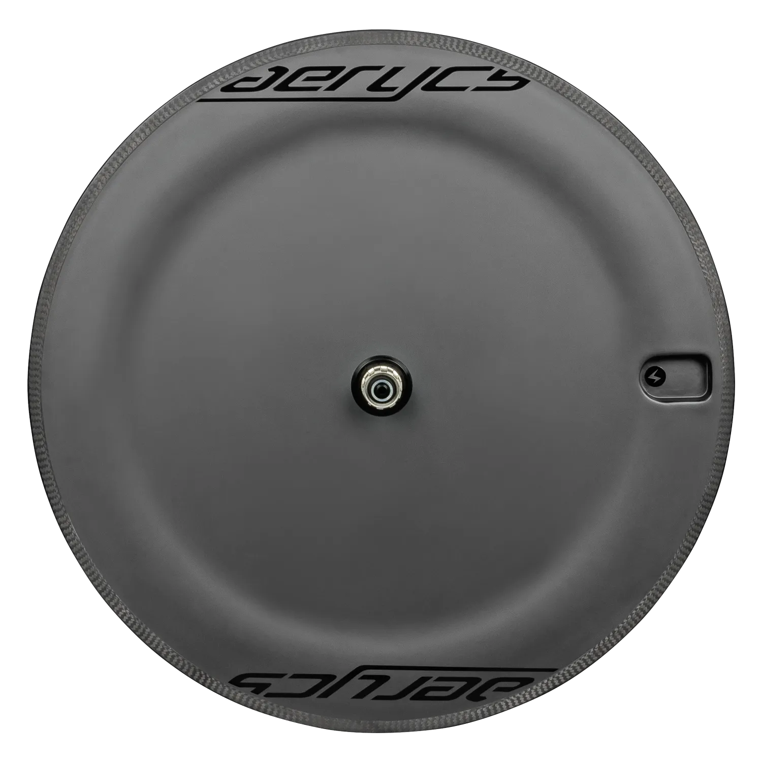 Die Frizzbee überzeugt im Vergleich zu den besten Konkurrenten und lieferte im Aerotesting hervorragende CdA-Werte. Das Innere des Scheibenrads ist mit Rohacell PMI aufgeschäumt. Die äußere Schicht besteht aus UD-Carbongewebe, bei dem die Carbonplatten nebeneinander gelegt werden anstatt sich zu überlappen. Dadurch sinkt das Gesamtgewicht des Laufrads und die Zugfestigkeit und Torsionssteifigkeit steigen. Trotz der tubeless-ready Fähigkeit, die deutlich mehr Material beim Aufbau benötigt, kann sich das Gewicht unserer Frizzbee Scheibe sehen lassen. Die Frizzbee Disc bauen wir mit der bewährten DT Swiss 350 Road Disc straightpull Nabe auf: eine preiswerte Hochleistungsnabe bei der Zuverlässigkeit auf Einfachheit trifft. Die Felgenbrems-Version ist mit der aerycs A1 straightpull Nabe ausgestattet. Eine aus Aluminium gefertigte Nabe, die dank Langlebigkeit und einfacher Wartung überzeugt.