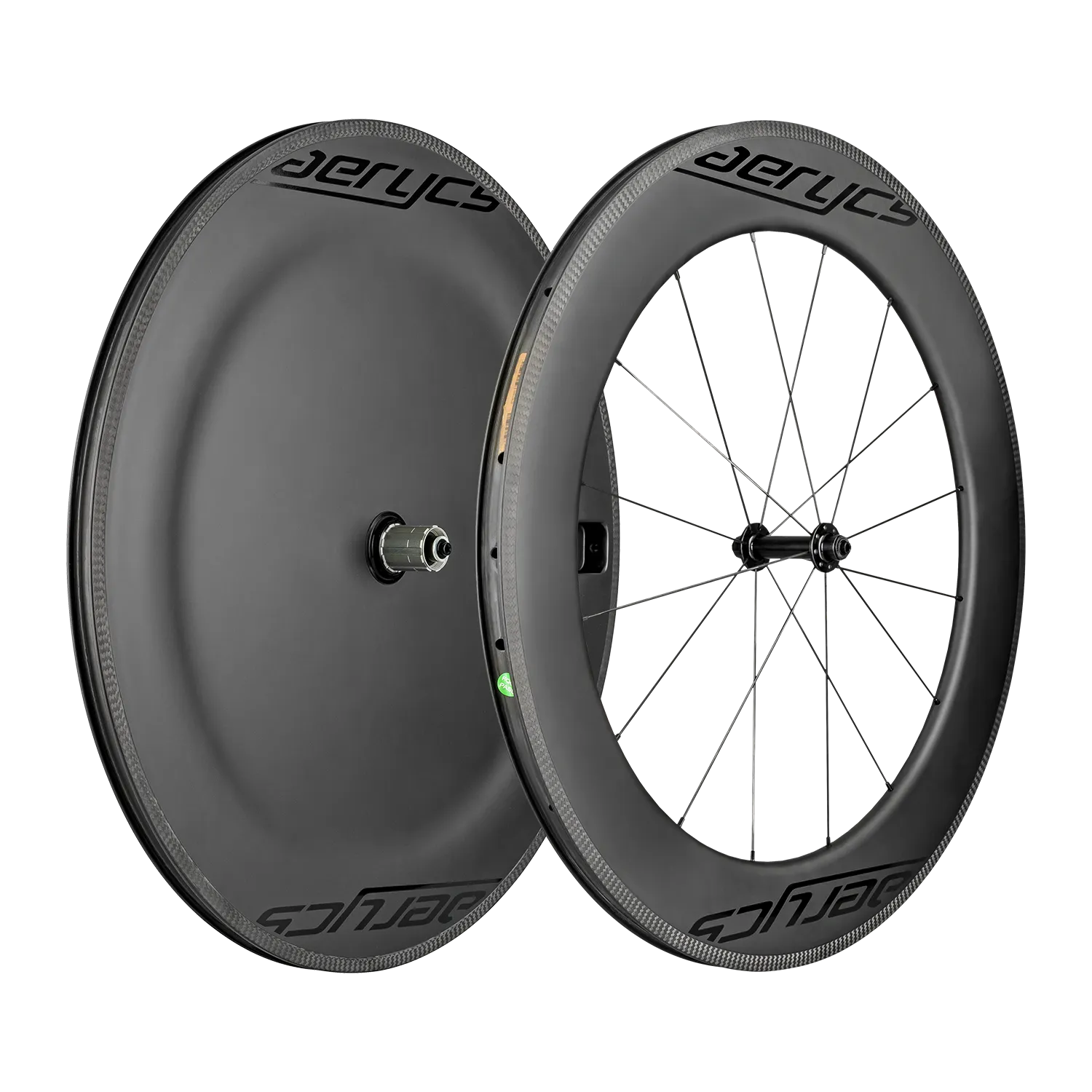 Die Frizzbee überzeugt im Vergleich zu den besten Konkurrenten und lieferte im Aerotesting hervorragende CdA-Werte. Das Innere des Scheibenrads ist mit Rohacell PMI aufgeschäumt. Die äußere Schicht besteht aus UD-Carbongewebe, bei dem die Carbonplatten nebeneinander gelegt werden anstatt sich zu überlappen. Dadurch sinkt das Gesamtgewicht des Laufrads und die Zugfestigkeit und Torsionssteifigkeit steigen. Trotz der tubeless-ready Fähigkeit, die deutlich mehr Material beim Aufbau benötigt, kann sich das Gewicht unserer Frizzbee Scheibe sehen lassen. Die Frizzbee Disc bauen wir mit der bewährten DT Swiss 350 Road Disc straightpull Nabe auf: eine preiswerte Hochleistungsnabe bei der Zuverlässigkeit auf Einfachheit trifft. Die Felgenbrems-Version ist mit der aerycs A1 straightpull Nabe ausgestattet. Eine aus Aluminium gefertigte Nabe, die dank Langlebigkeit und einfacher Wartung überzeugt.
