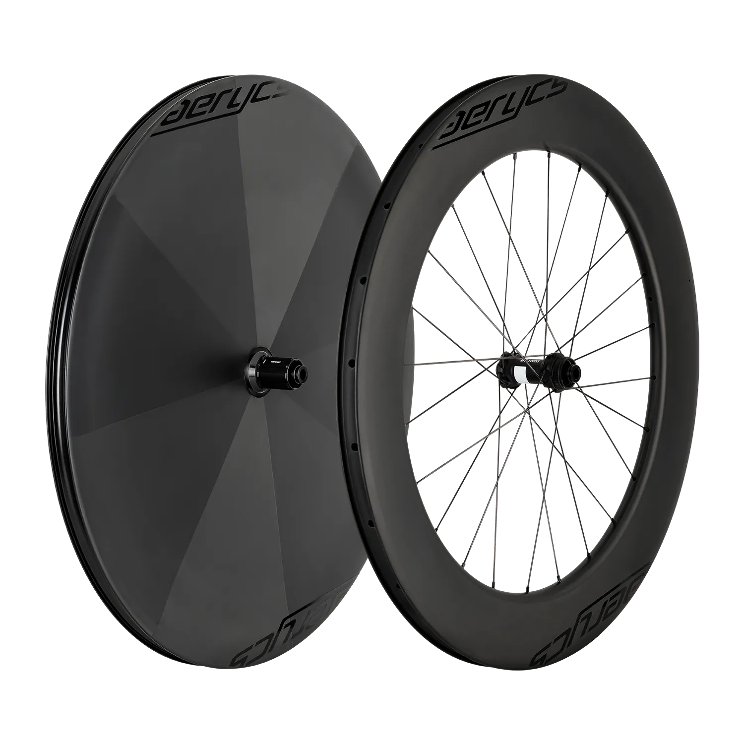 Die Frizzbee überzeugt im Vergleich zu den besten Konkurrenten und lieferte im Aerotesting hervorragende CdA-Werte. Das Innere des Scheibenrads ist mit Rohacell PMI aufgeschäumt. Die äußere Schicht besteht aus UD-Carbongewebe, bei dem die Carbonplatten nebeneinander gelegt werden anstatt sich zu überlappen. Dadurch sinkt das Gesamtgewicht des Laufrads und die Zugfestigkeit und Torsionssteifigkeit steigen. Trotz der tubeless-ready Fähigkeit, die deutlich mehr Material beim Aufbau benötigt, kann sich das Gewicht unserer Frizzbee Scheibe sehen lassen. Die Frizzbee Disc bauen wir mit der bewährten DT Swiss 350 Road Disc straightpull Nabe auf: eine preiswerte Hochleistungsnabe bei der Zuverlässigkeit auf Einfachheit trifft. Die Felgenbrems-Version ist mit der aerycs A1 straightpull Nabe ausgestattet. Eine aus Aluminium gefertigte Nabe, die dank Langlebigkeit und einfacher Wartung überzeugt.